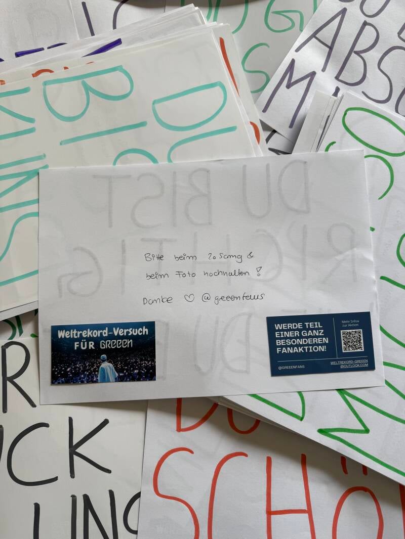 Um GReeeN bei der Dropical GReeeN Tour zu überraschen & das Konzert auch für euch Konzertbesucher unvergesslich zu machen, haben wir unzählige Zettel mit positiven Zitaten von GReeeN vorbereitet. Diese sollten dann beim zweiten Song und beim Foto hochgehalten werden.