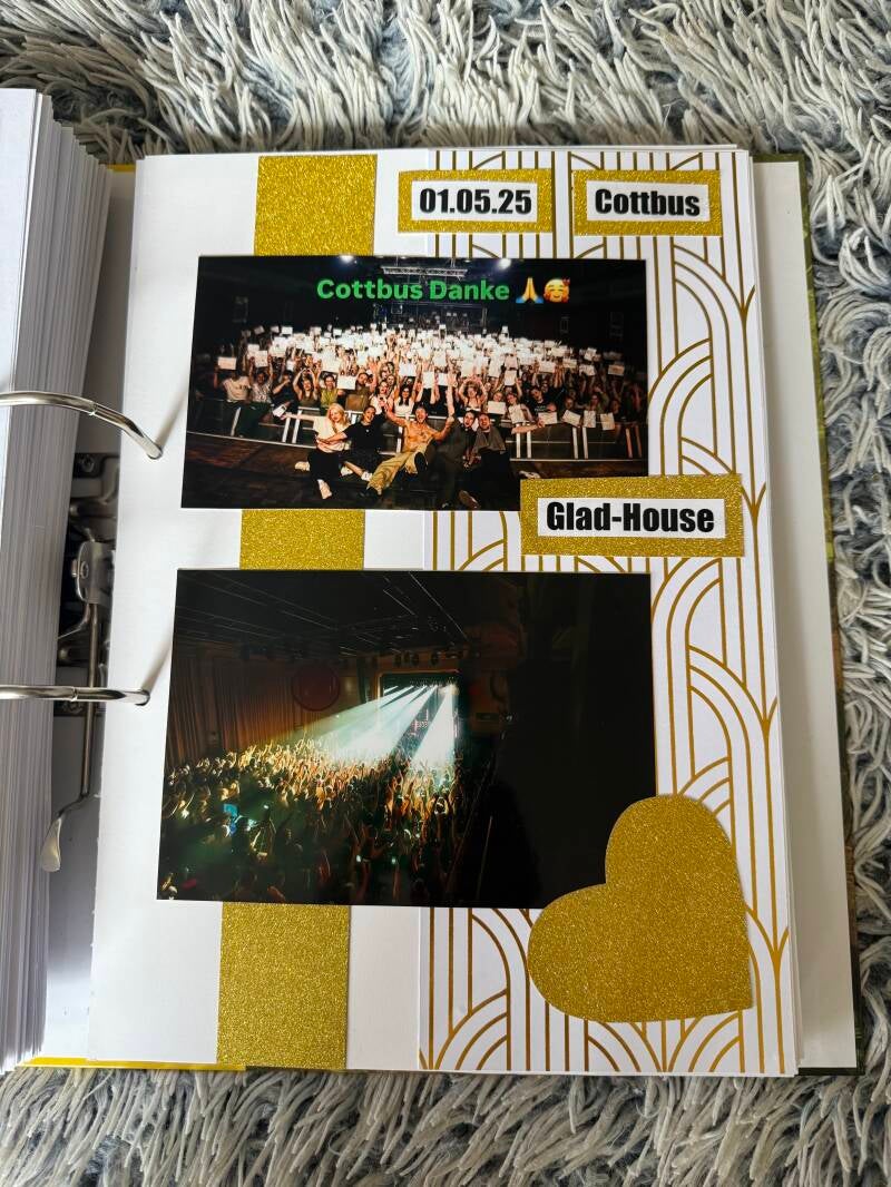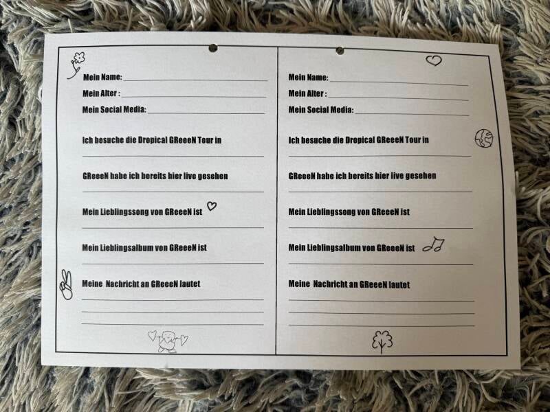 Auf der Dropical GReeeN Tour haben wir die Fam in den Warteschlangen gebeten, Zettel für ein Freundschaftsbuch auszufüllen. Daraus ist ein einzigartiger Ordner entstanden, gefüllt mit persönlichen Einträgen und Erinnerungen der Fans sowie vielen Fotos von der Tour.