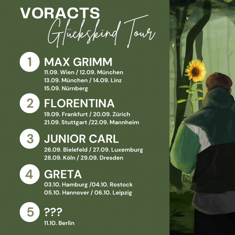 GReeeN hat für die Tour bisher 4 verschiedene Voracts eingeladen, lediglich für Berlin wissen wir bisher nichts über den Support. Wir haben euch eine Übersicht über die Voracts in den einzelnen Städten erstellt.