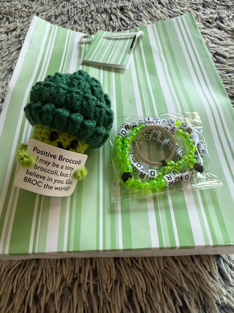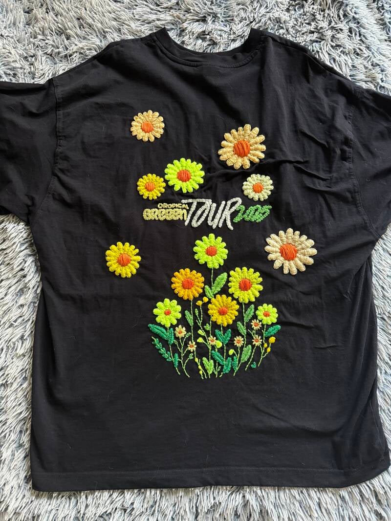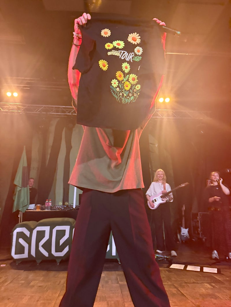 Da GReeeN ein paar Tage vor der Tour Geburtstag hatte, haben wir uns ein nachträgliches Geburtstagsgeschenk für ihn überlegt. In Cottbus zum Tourstart erhielt er daher von uns ein handbesticktes „Dropical GReeeN Tour 2025“ Shirt, einen positiven Brokkoli sowie ein Armband und Schlüsselanhänger.