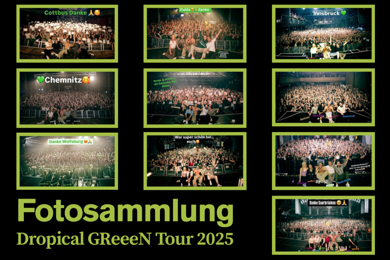 Die letzten beiden Konzerte der Dropical GReeeN Tour 2025 müssen zwar noch nachgeholt werden, dennoch haben wir bereits eine Fotosammlung für die Tour erstellt. Schaut euch die bisher gesammelten Fotos bereits jetzt an & schaut immer wieder vorbei um die Sammlung wachsen zu sehen!