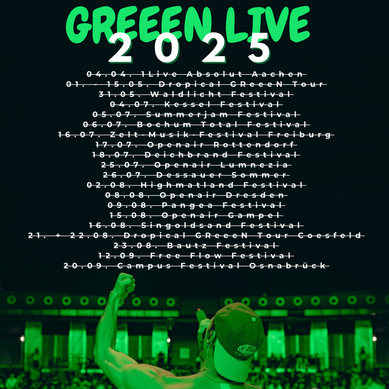 Wie für jedes Jahr haben wir eine Live Übersicht mit allen GReeeN Auftritten im Jahr 2025 erstellt. Die geplanten Auftritte für dieses Jahr sind leider vorbei - aber wir wollen noch einmal auf alle 31 Konzerte, Openairs und Festivalauftritte zurückblicken!