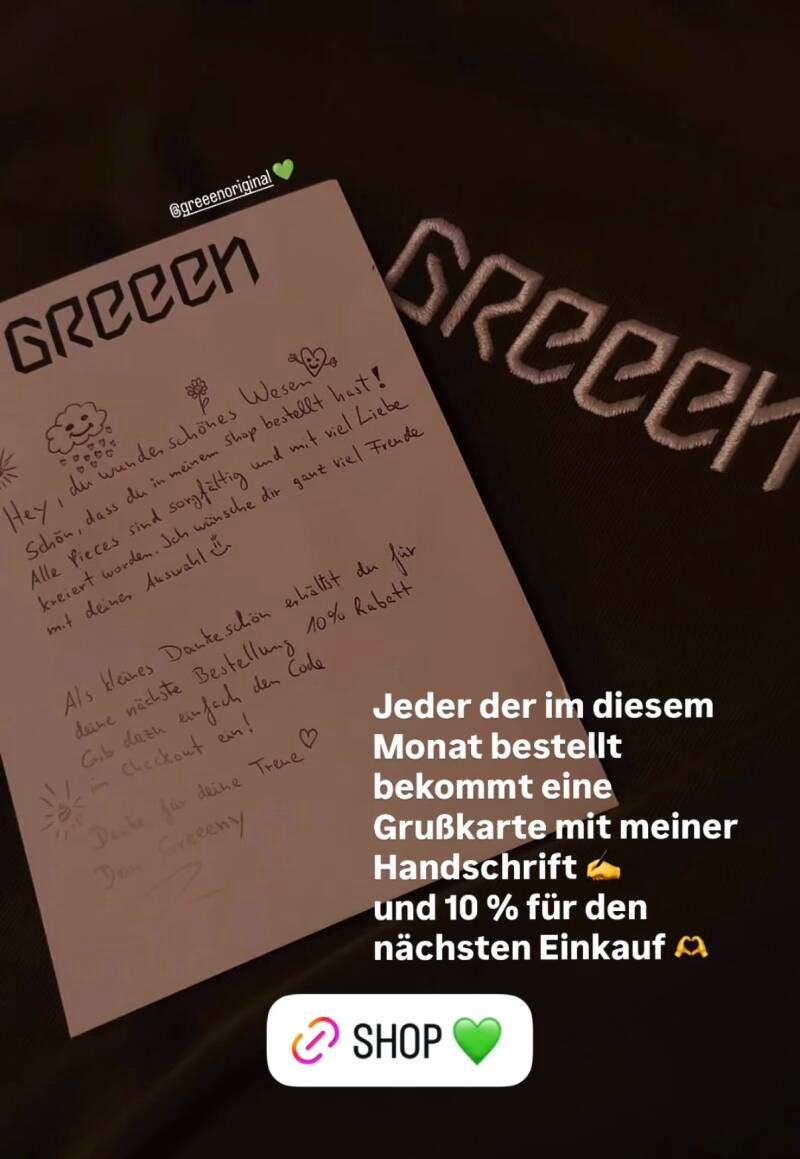 Zu jeder Merch-Bestellung legt GReeeN eine handgeschriebene Grußkarte bei. Zusätzlich gibt es einen 10-Prozent-Gutschein für den nächsten Einkauf.